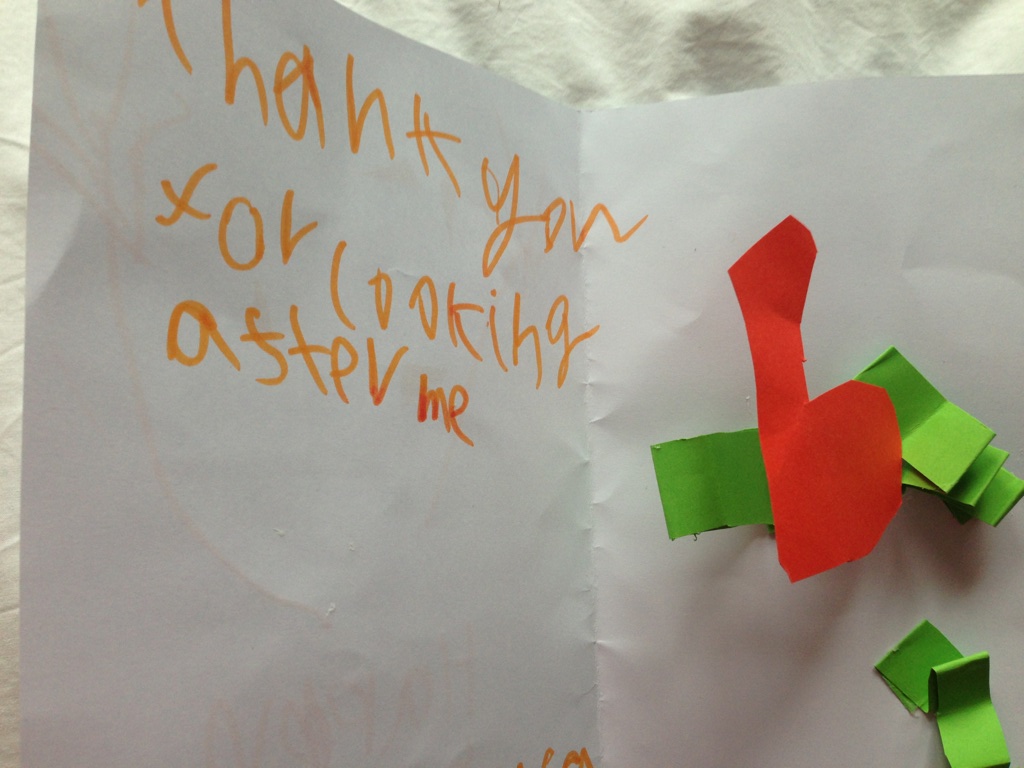 But today, Mother’s Day, they both came running down into our bedroom where we were still sleeping off yesterday’s hangover, giggling with cards they had made. Ava’s had the requisite tissue flowers of nursery school, complete with a spiky drawing of a bald stick person with sticky elongated arms to represent me, with an approximation of her name scrawled with a spiral for an e where she had forgotten where to stop. Jonah’s said ‘Happy Motho’s Day’ (nice use of apostrophe though, so extra points for effort), and an immature drawing that he said was fireworks- but when I opened it up, he’d made a pop up heart coming out the centre of the card. “Thanks for looking after me” it said in passably legible writing, and I had a gentle, motherly weep, because the one thing I can guarantee about him is that he means what he says.