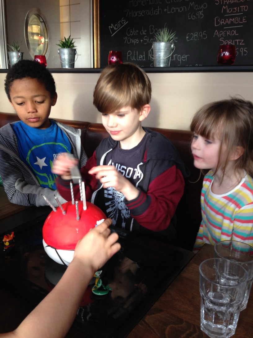 Jonah’s still monosyllabic on the phone, thanking his beloved grandma robotically for her thoughtful gifts – things to make and do that hopefully the childminder will get stuck into with him, saving me the bother. Crafts aren’t really my strong suit. I’m glad she bothered. I was so tete en l’air after Christmas and with going back to work, I forgot to buy him a card. I’m not much into birthday cards either for the record. Luckily, neither is Jonah. We made it up to him though (not that he noticed). We took him out for burgers with a kid from his class, a nice boy with an older brother who has manners that put my son’s to shame, and a conversational gentility that brought out Jonah’s inner heathen. I found myself acting up to make up for it, asking the poor lad questions that I hoped didn’t make me sound uncool, but he didn’t seem all that impressed. The pair of them, and Ava, got jacked up on sugar with a bright blue bubblegum flavoured ice cream the restaurant presented them with after our meal for free, but we’d got cupcakes at the ready at home, and by the end of the evening, all three kids, (sleepy Ava looked off her tits) were spinny eyed and floppy, playing statucal musics – a game of Jonah’s invention, whereby one dances when the music stops and stands still when it starts.
