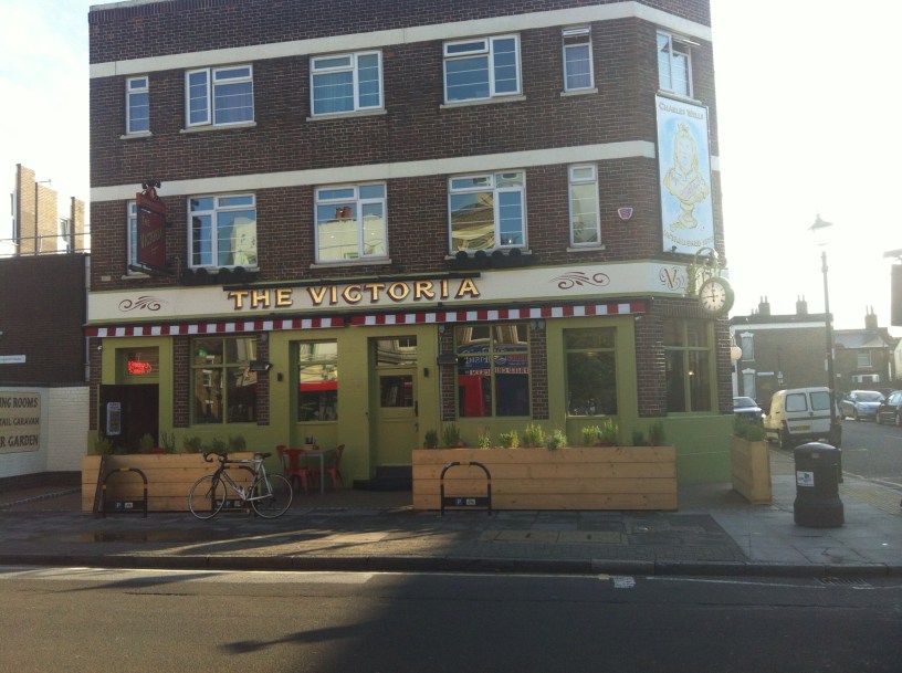 I was beginning to feel smug from my morning’s fast: headache reassuring me that detox was underway, last night’s chantilly burned off, ketosis achieved in sour breath, my jeans comfortingly looser than when I pulled them on, starched and stiff first thing. But Tom, who’d grown tetchy from hunger and suitcase lugging, wanted to prolong the holiday for one more meal. Our fridge contained, of all things, some parma ham and last month’s homemade blackberry jam, so we piled off, first batch of laundry in the machine, to our revamped local, The Victoria on Grove Road, which now sports all the jolly, camp charm of a Punch & Judy show, all red and white striped canopy, and tiled floors, coffee shop area, and slightly wanky “English Tapas” menu, in contrast to its previously, dark and studenty, loved but lived in, burger-in-a-bag incarnation.