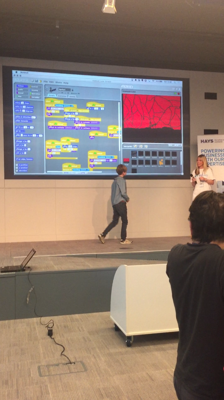 At this, the second time we have been to a Coderdojo event (one of the school dads, Neil Allgood, is part of the team from Barclays organising the event) Jonah got the opportunity to show his work to a crowded room of peers – kids from his school, and around the local area, their parents, and event organisers, young mentors and partners. For a boy who can talk at length about his particular passion, but struggles to remember social niceties, it was really good to see him take the stage, and talk about his game, “No Pause” – an elaborate and jumping and rolling game – even if the pressure to perform saw him die three times in quick succession. But he took it all in his stride in this very nurturing environment, where he was far from the only kid who struggled with the basics of eye contact and smooth verbal delivery. And even Ava, who at just seven has never really coded before, managed to create a good game with Tom’s patient assistance, and seemed to get a lot out of the session, even while lacking Jonah’s obsessive dedication.