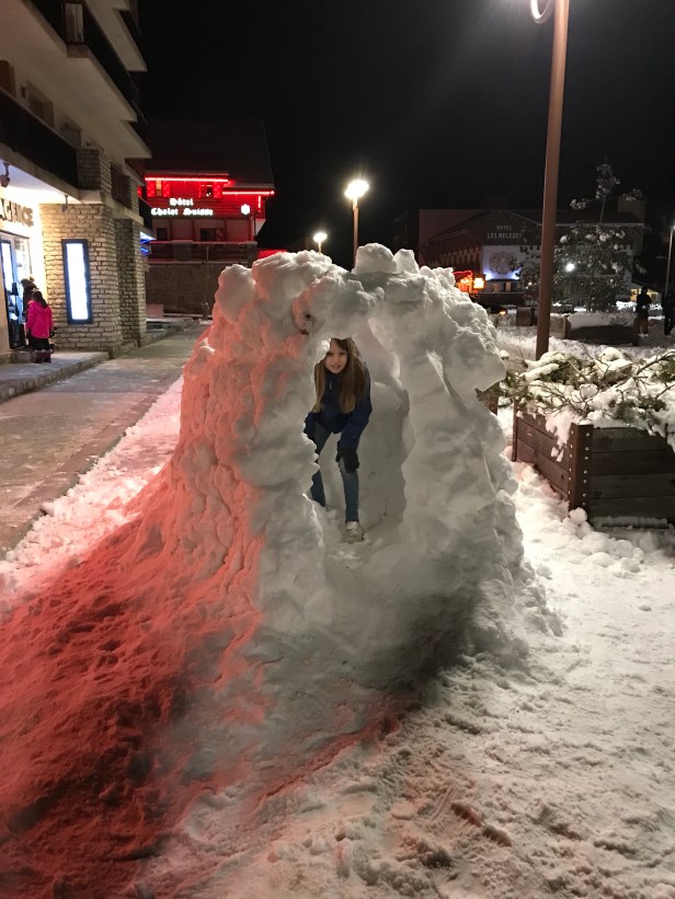 Jonah and I had philosophic conversations on ski lifts, Ava preferring the more pedestrian (that is to say, less esoteric) cable car banter and calme reassurance of Tom’s rather more confident ski-persona; The boy having well and truly outstripped me, skill wise, this time: initial caution thrown to the wind replaced by daredevil antics and slick manoeuvres. At his best, through a canteen lunch of stew and tarte framboise, he gamely sat through a meal of heated fromage which previously would have sent him into an oversensitive meltdown, though he ate spag bol – I having banned yet another hamburger frites.
