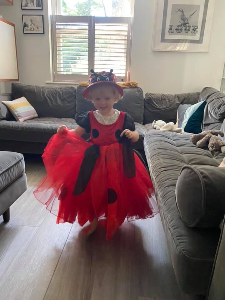 We arrived at the Palace Theatre to a mess of building work marring Charing Cross Road. Luckily, it being the premier, we were also greeted by an arch of balloons, which caught her attention and, after putting on the ladybird dress to wild acclaim from passers by, some shenanigans with the Covid app and locating my virtual ticket, we were able to take our seats three rows from the front (at a Covid-safe distance from the performer) in a thankfully air-conditioned building (it was pushing 30 outside).